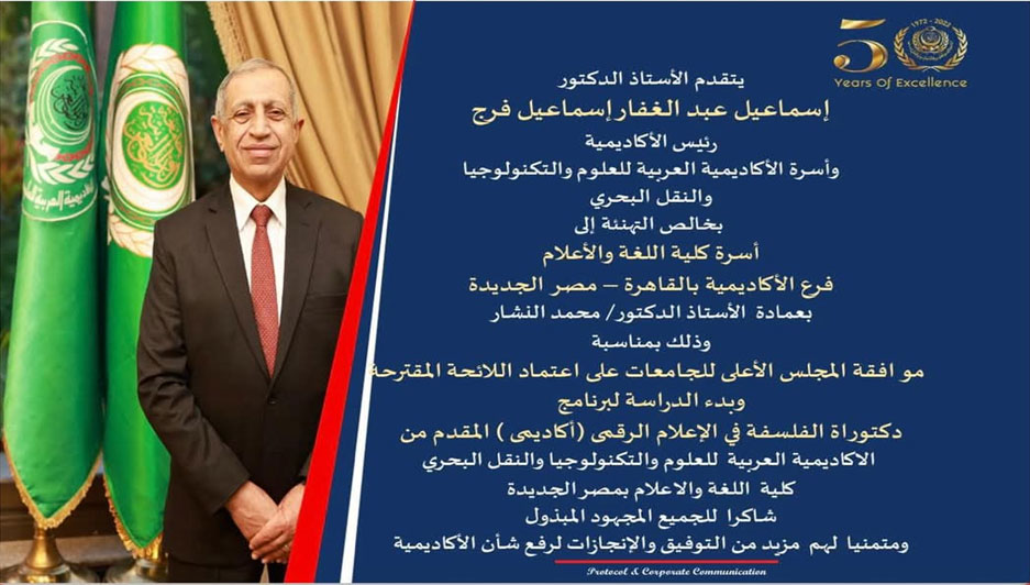 تهنئة سعادة رئيس الأكاديمية ببدء الدراسة لبرنامج دكتوراة الفلسفة فى الإعلام الرقمى