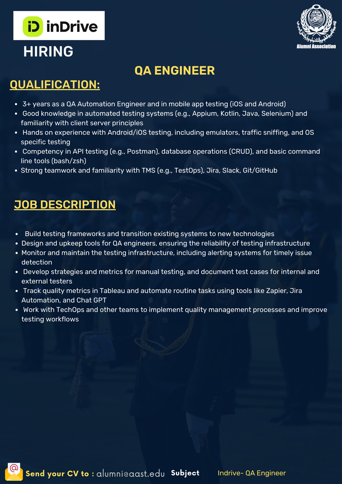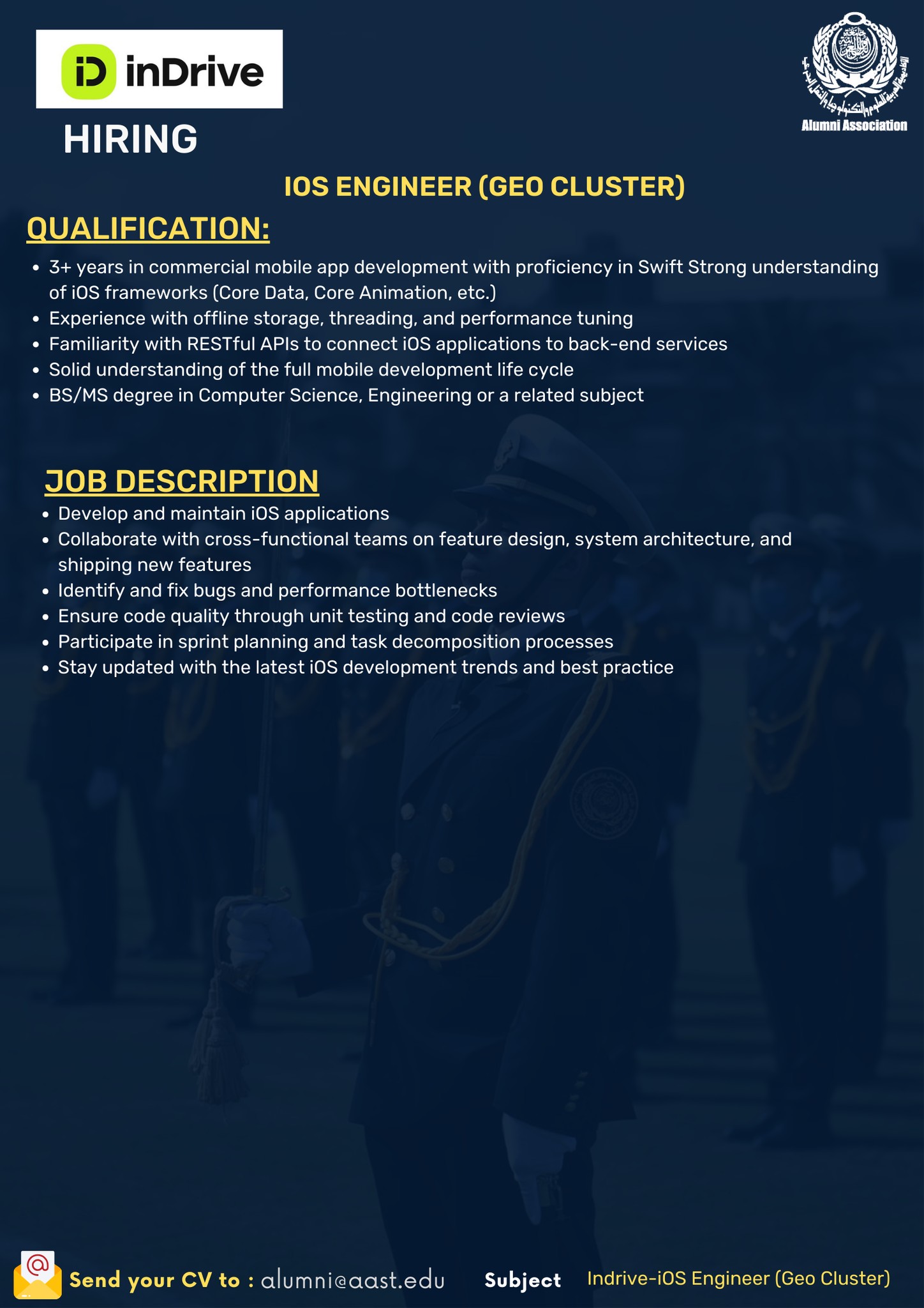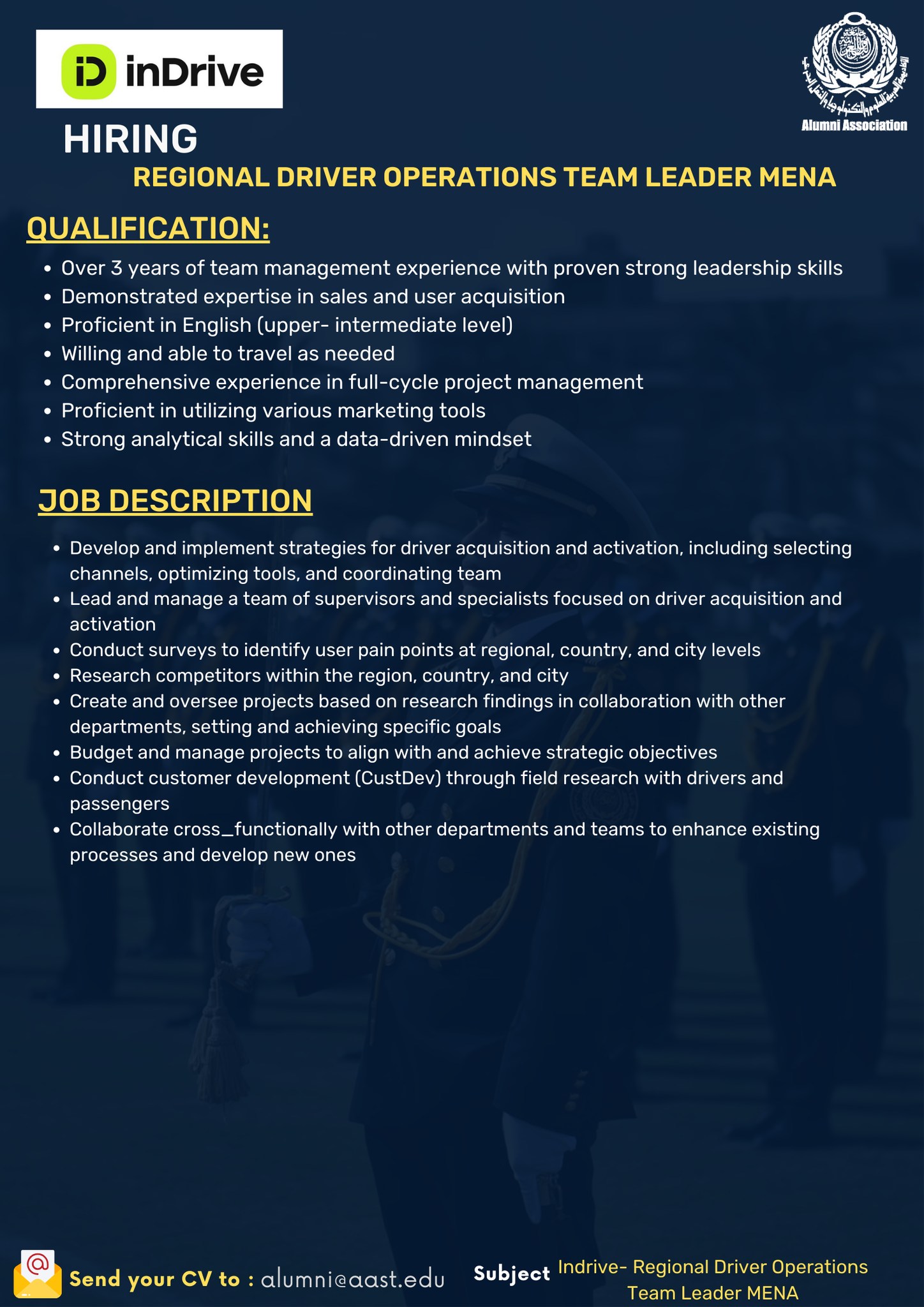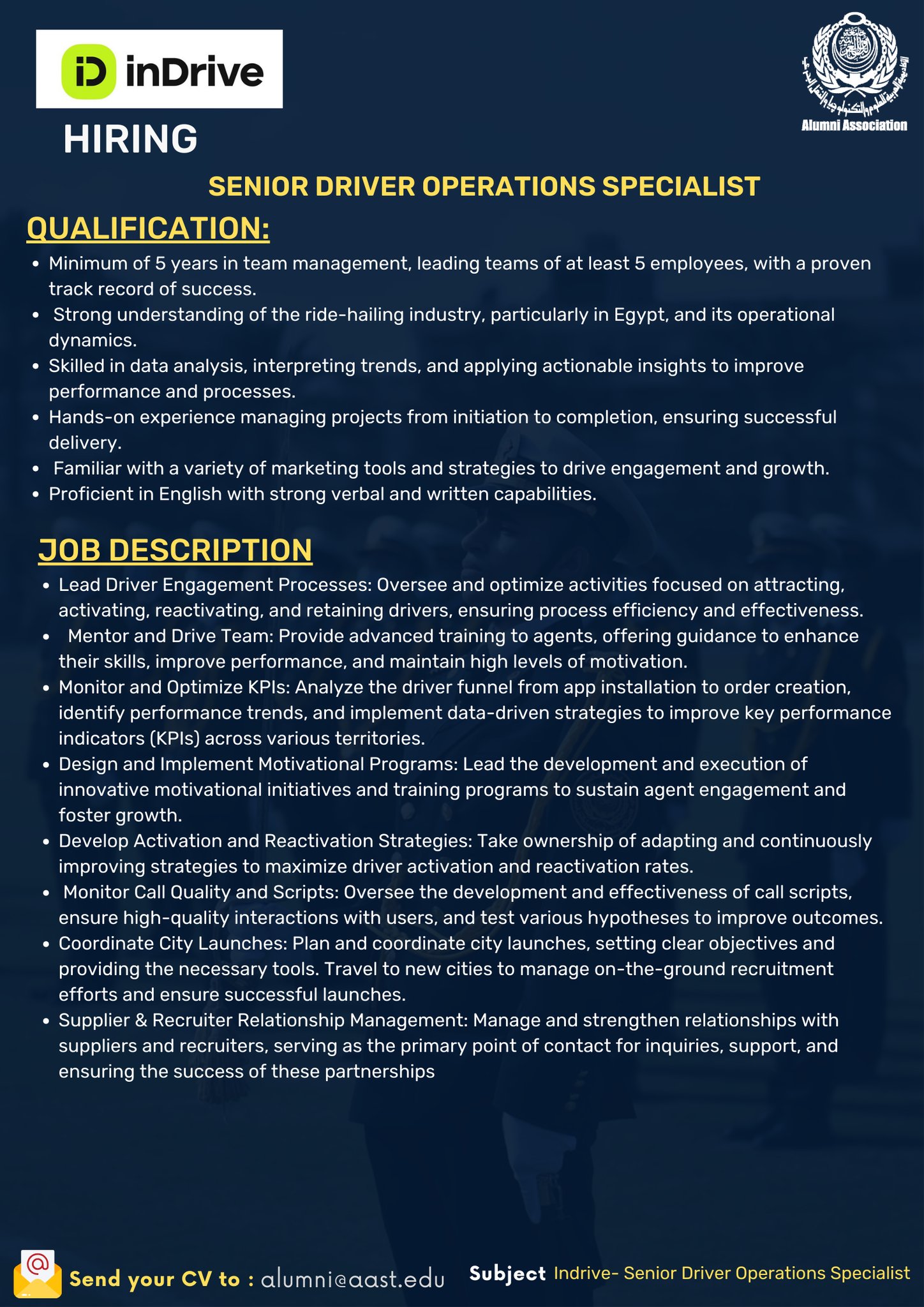 Attention AASTMT Graduates! In Drive is looking for talented graduates to fill a number of exciting new opportunities!Here are the open positions:Back end EngineerQA EngineerEngineering ManagerRegional Driver Operations Team Leader MENADrivers Marketing Team Leader EMEAiOS Engineer (Geo Cluster)Senior Driver Operations SpecialistFinancial ControllerSenior Business Development SpecialistTo apply, simply send your CV to Alumni@aast.edu with the subject line and the position you are applying for. Share: