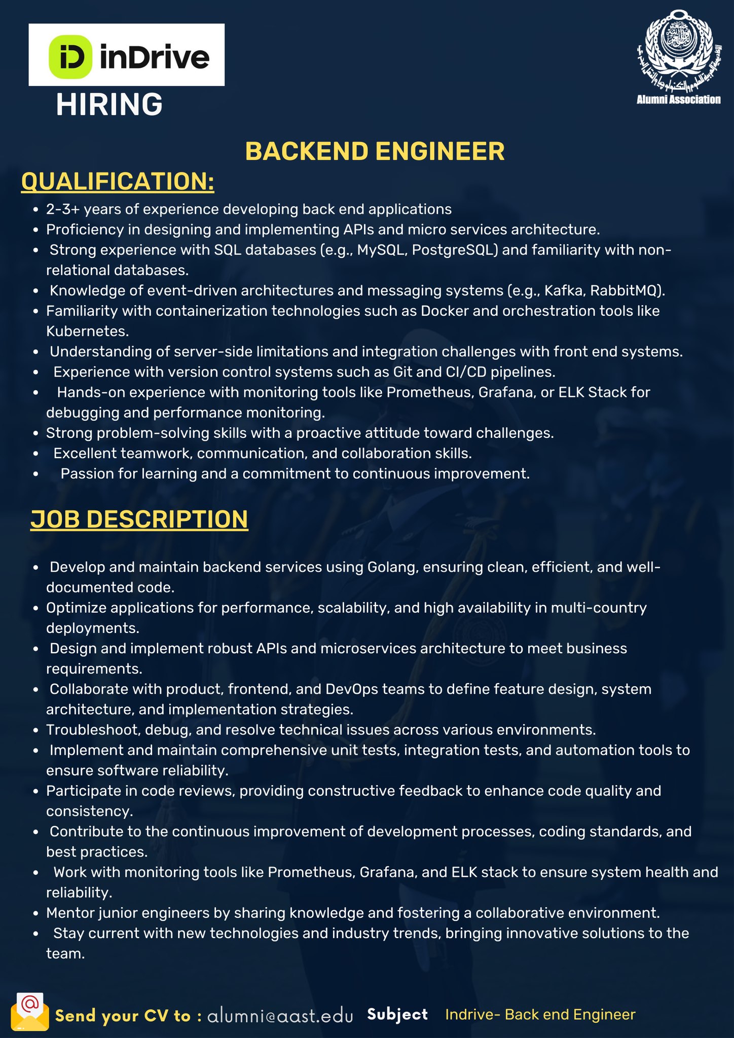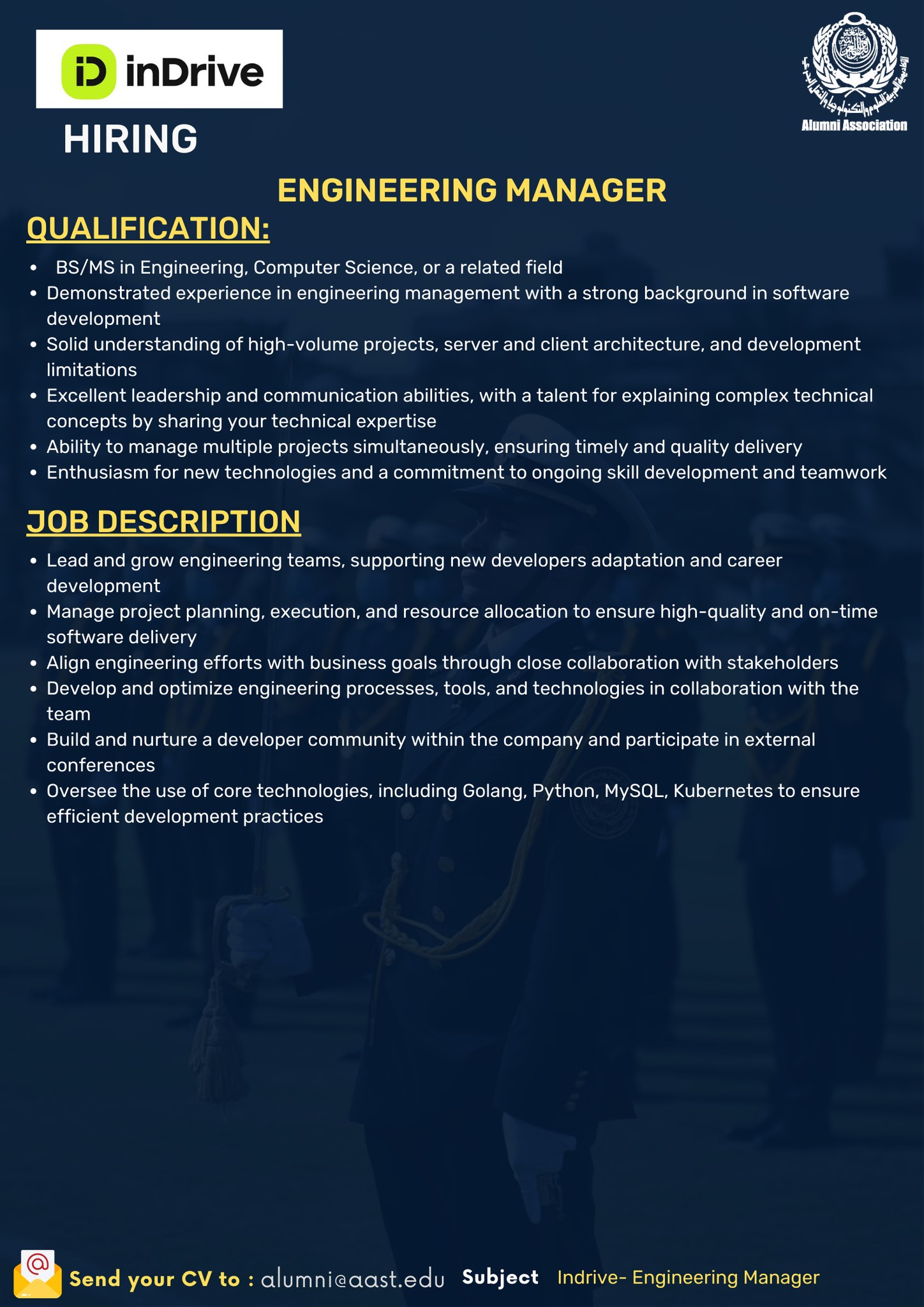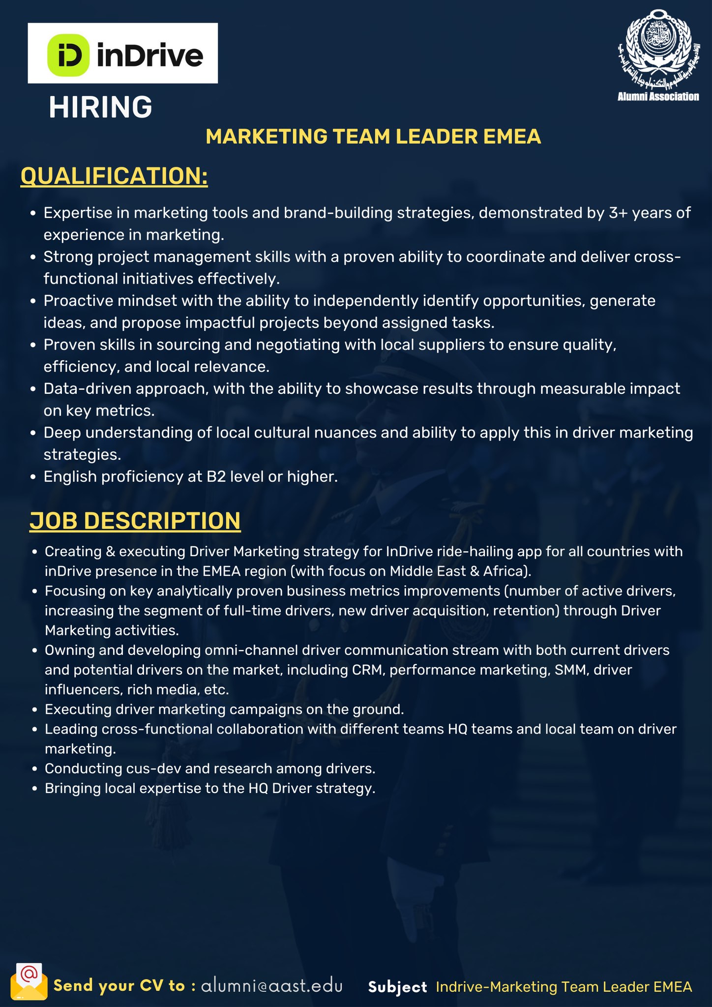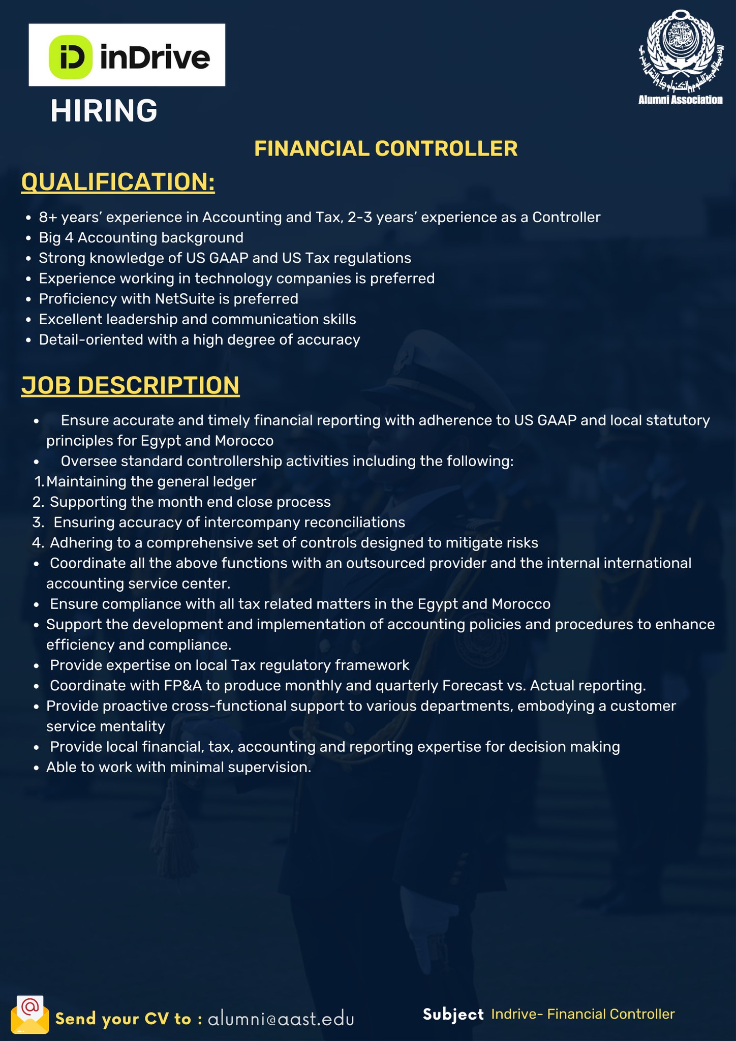 Attention AASTMT Graduates! In Drive is looking for talented graduates to fill a number of exciting new opportunities!Here are the open positions:Back end EngineerQA EngineerEngineering ManagerRegional Driver Operations Team Leader MENADrivers Marketing Team Leader EMEAiOS Engineer (Geo Cluster)Senior Driver Operations SpecialistFinancial ControllerSenior Business Development SpecialistTo apply, simply send your CV to Alumni@aast.edu with the subject line and the position you are applying for. Share: